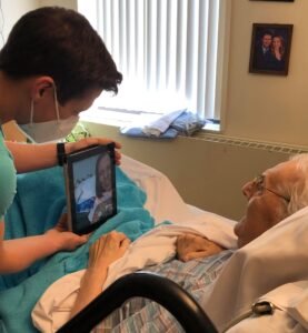 Contact our Activities Department at 989-779-5526 to let them know who you’d like to video chat with, they’ll make sure that resident is set-up with one of our facility’s devices.